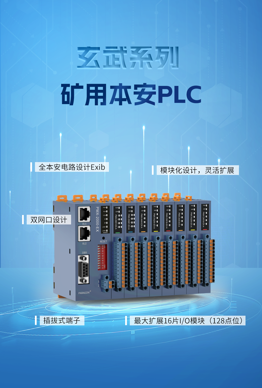 PMX 玄武系列PLC产品 , 以 IEC61131 为依据、在电路设计原理上严格执行 GB3836.1-2021 与 GB3836.4-2021 标准 , 符和 “矿用本质安全型设备” 的规定 , 安装于本安腔内 , 可以直接在煤尘、瓦斯等煤矿场合中使用。 采用自主嵌入式实时操作系统,编程方式支持 IEC61131-3 规定 的 5 种编程语言,可实现网络异构和数据汇聚。