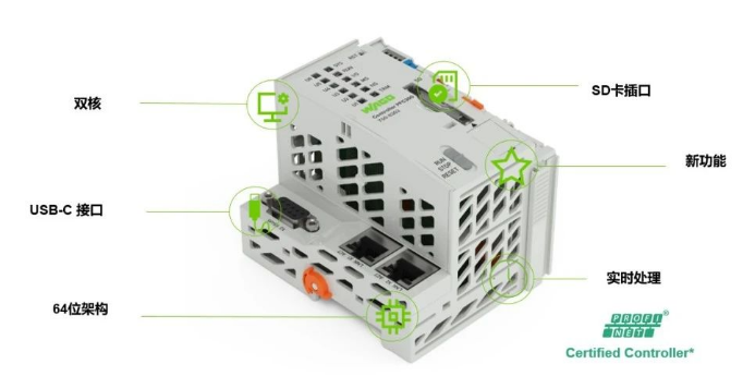万可PFC300控制器具有2GB RAM和64位双核处理器,拥有快速的数据处理能力,功能强大且灵活,适用于中大型应用,是处理高要求任务的理想之选!PFC300还可实现无缝编程、控制及可视化功能,其卓越性能更支持跨行业多样化应用。