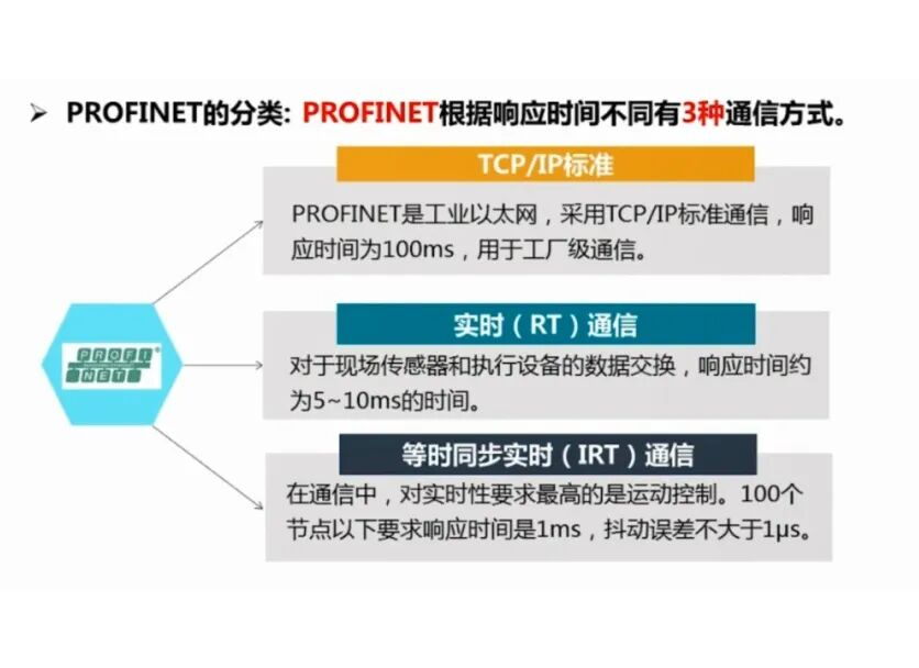 Profinet的分类:根据响应时间有三种通信方式。第一个是TCP/IP标准通信。Profinet工业以太网采用TCP/IP标准,响应时间为100毫秒,用于工厂级的通信。比方说我们进行故障诊断的时候,就可以采用这个标准。