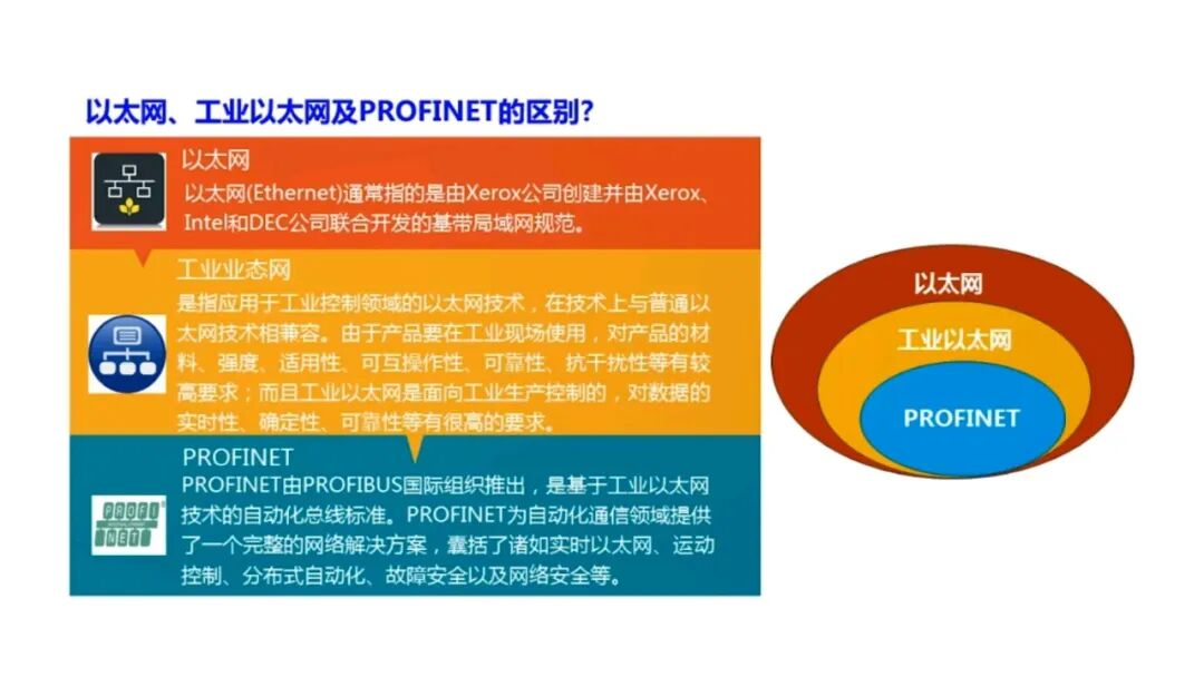 那么以太网、工业以太网和Profinet的区别是什么呢?以太网是指由施乐公司创建,并由施乐、英特尔和DEC联合开发的基带局域网规范,这个我们前面已经说过了。那么什么叫工业以太网?工业以太网就是用于工业领域的以太网,在技术上与普通以太网相兼容。由于产品在工业现场使用,对材料强度、适用性、可靠性、抗干扰性都有较高要求,而且工业以太网面向工业控制,对数据的实时性、确定性、可靠性要求较高。