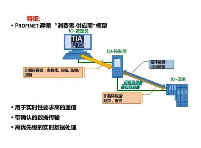 我们来看看Profinet的通信模型。上位机和我们的IO控制器站进行通信。注意,这个通信是非循环数据,主要是用于参数化、诊断和监控,这个通信不是实时通信。IO控制器站和IO设备站之间的通信,这种在我们工控现场用的是最多的,它是循环数据通信,是实时通信。