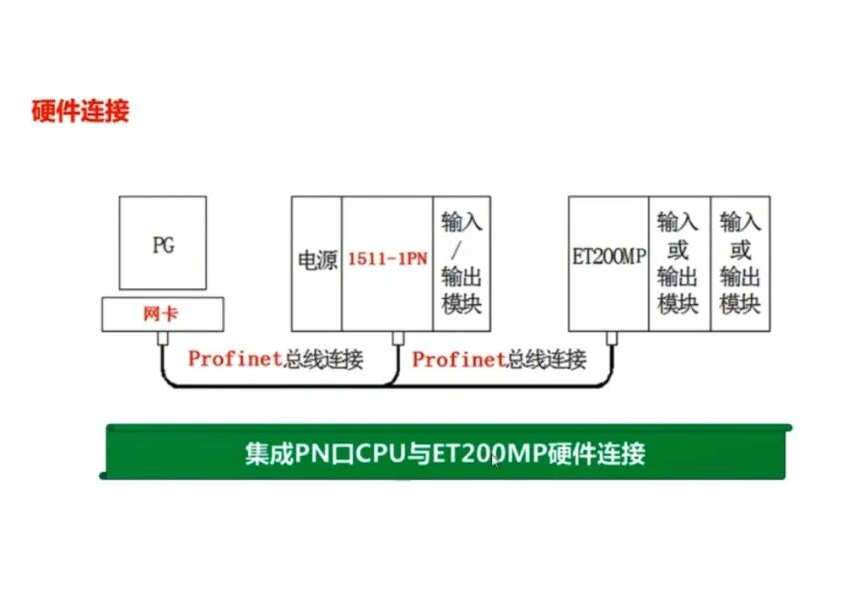 需要网线和一套博图软件。我们来看看这个架构:CPU1511加上输入输出模块,ET200MP分布式IO站,其接口模块就是这个IM155-5 PN,还有数字量输入模块、数字量输出模块等等。这个通信架构实际上是集成PN口的CPU与ET200MP之间的连接。这个操作很简单,我们只要把CPU拖拽进来,再把IM155拖拽进来,直接把它们连接起来就可以了。