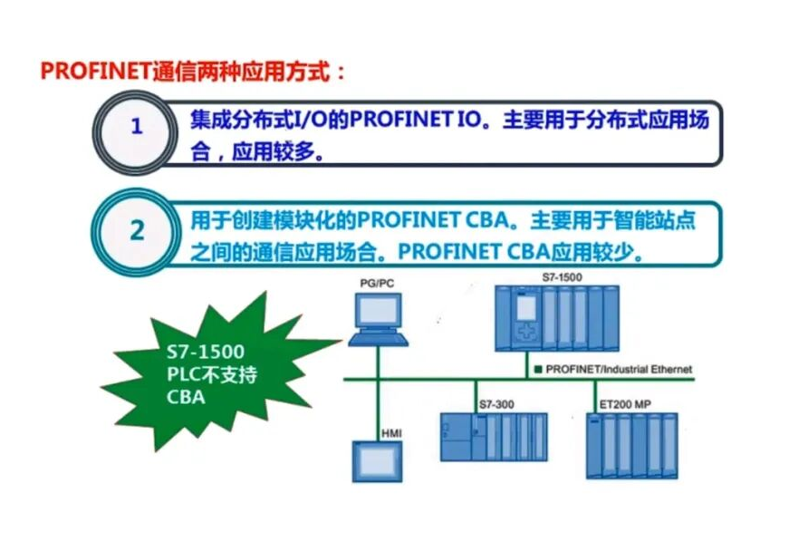 Profinet又有两种应用方式,一种是Profinet IO,这个应用比较广泛。第二个是Profinet CBA,主要用于智能站点之间的通信。Profinet CBA应用较少。S7-1500的PLC不再支持CBA这个功能,而过去的S7-300和S7-400是支持的。