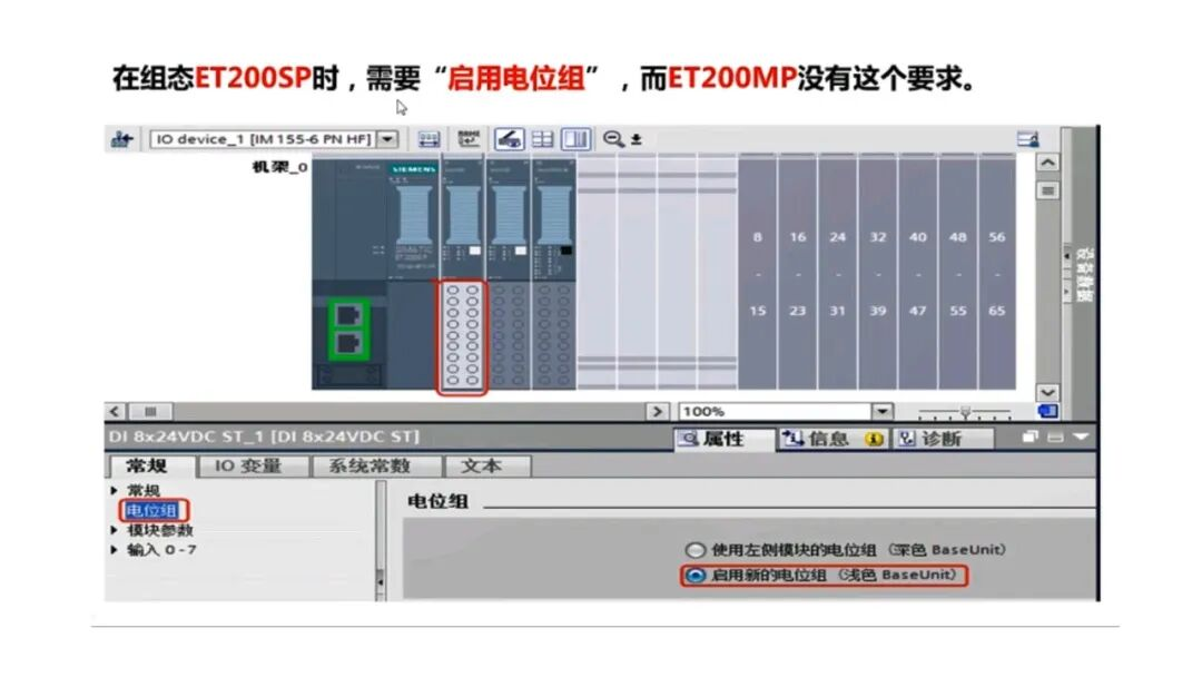 只有浅蓝色的模块需要启用电位,深色的模块不需要。就像我们这个图样,这么多模块,只有这一个需要启用。那么如果说我现场全部是浅颜色的模块,你也可以只启用一个,其他的不启用也可以。浅色的模块至少要启用一个,也可以启用多个。ET200SP支持热插拔,而PLC本机的IO模块不支持热插拔。要注意浅色的模块比深色的模块是要贵一些,就是同样的型号规格的话,它要贵一点点。